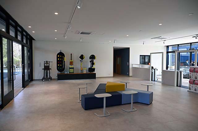 記念館の内部.かつての展示品の一部が置かれていた.今後,充実の予定だという.入退場のシステムはセルフレジと二次元コードを連動させたセキュリティゲート.画面右端のゲートが,それ.