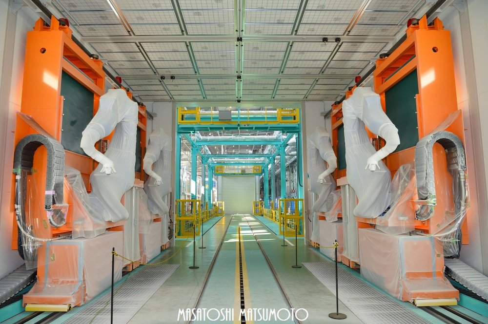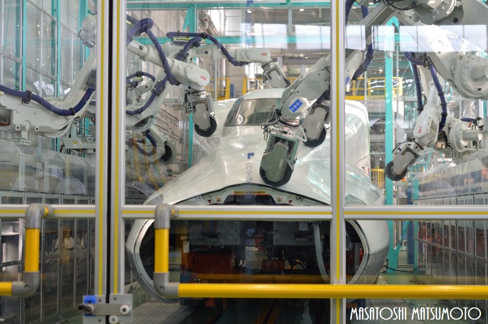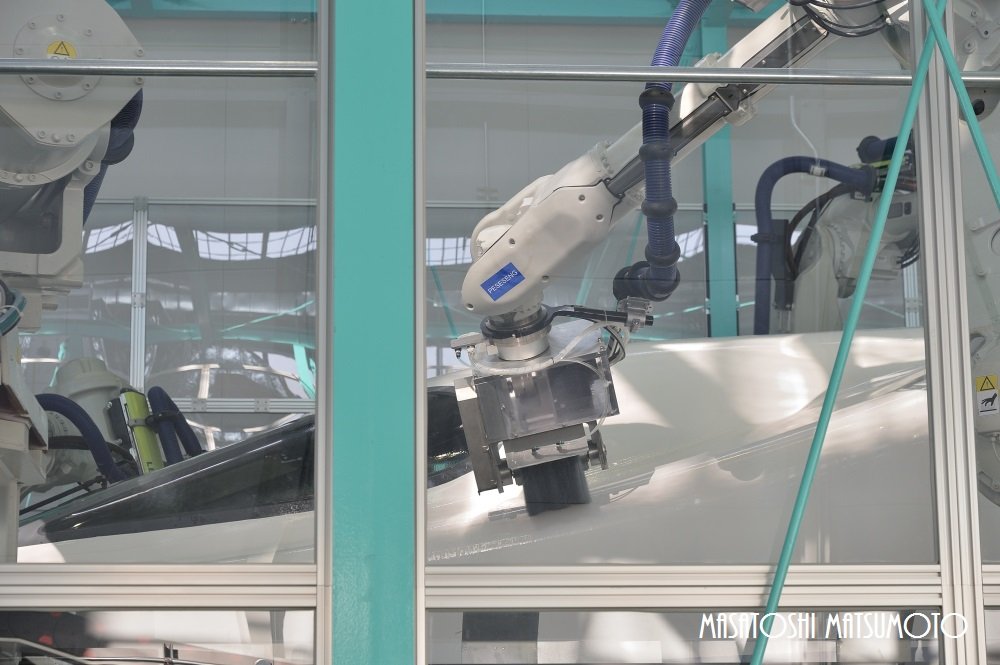 塗装場では塗装の密着を良くする為に塗装する面に凹凸をつける研ぎ作業を人力から新幹線初のロボットによる作業に変更。6本のアームが色々な動きをしながらN700の複雑な前面に対応していきます。
