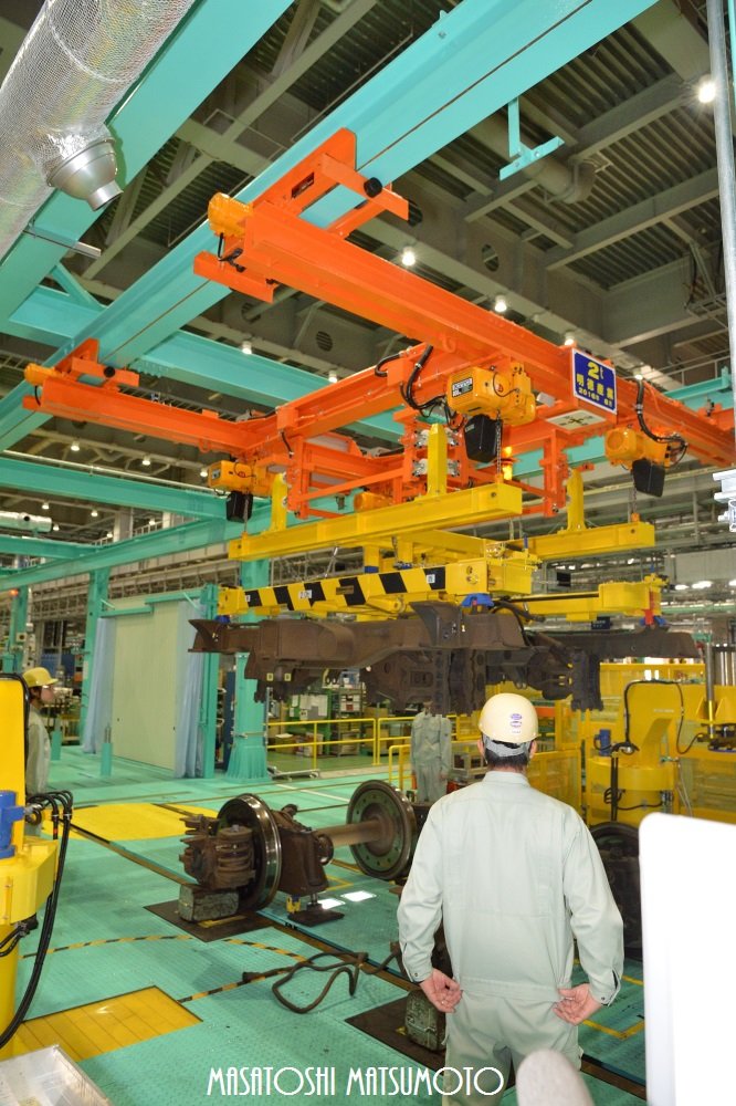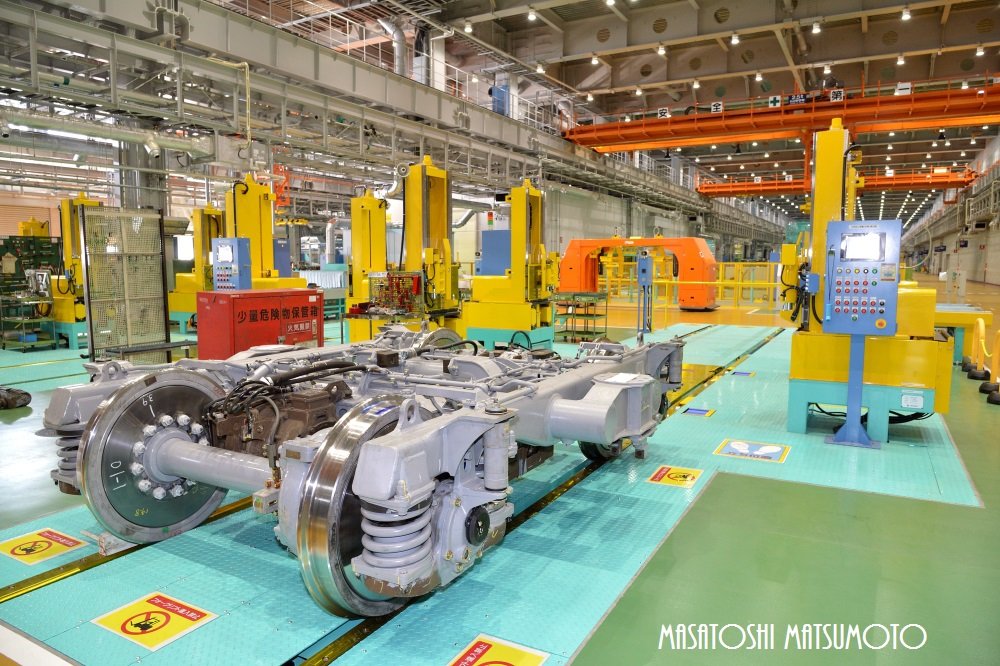 台車検修場に運ばれ台車枠と車軸を分離後専用ラインにて進む。検修後台車を組み立て走行試験で完成する。