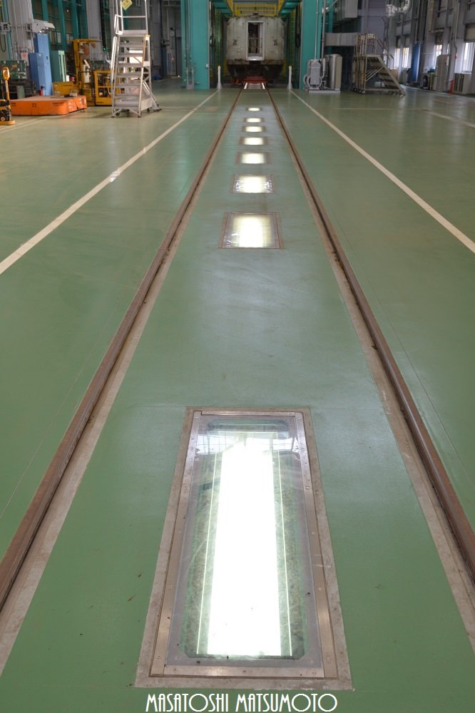 その後、台車はアントにて台車検修場に向かい車体は仮台車にて作業が続く。暗い床下は下からの照明で明るく環境改善された。