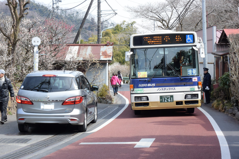 現地へはJR高尾駅北口からバスが出ており、今はシーズンで梅まつりも開催されている事から増便もされています。昨日は日曜日も重なってバス停は大行列でしたが、多少ダイヤは乱れ気味でしたが、どんどんやって来るのですぐに乗車は可能でした。