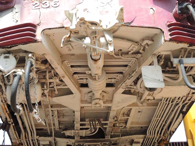 車体吊りという作業のなにが興味深いかといって,モデラーにはとにかく台枠を下から覗くことができる貴重なチャンスということ.連結器の腕がとにかく長いこと,そして首振り角度を確保するために台枠の梁が大きな三角形上に組まれていたことが,今回のさまざまな発見のうちのひとつ.インターバン的鉄道の電車の特徴のひとつであるわけだが.