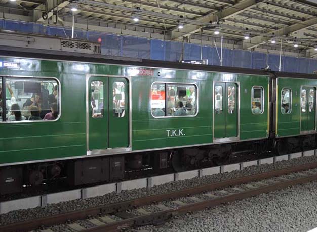 残念ながら,全編成を緑色にしたわけではなくて,1編成8輛にラッピングを施したもの,今の5000系は青ガエル本来の東横線ではなく,田園都市線用のはず….けれど,5118,5119,5121,5122の4編成だけが,車輛需給の調整の結果として,東横線を走っているものだから,その中の最新である5022を,“再来 青ガエル”に仕立てた,というストーリー.