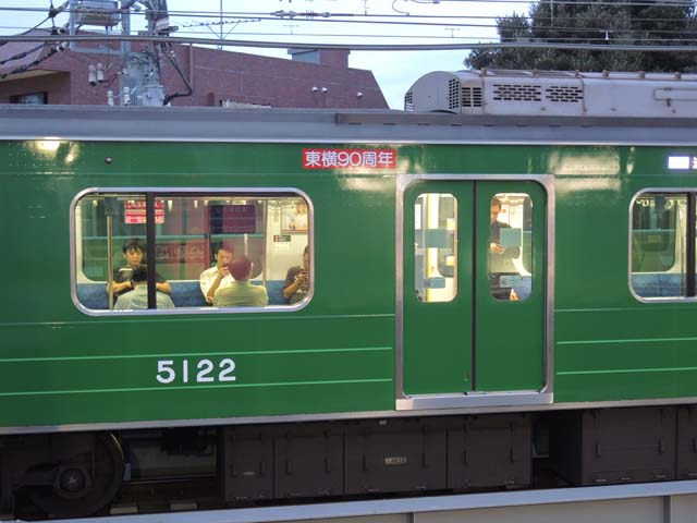 停止状態の編成全体を撮ろうと思ったら,渋谷方面行きホームから横浜方面行き列車の最後尾を撮るしかなかった.ということで,さっきと同じ5122を山側から.正面左下裾の白い部分は,上が往年の急行札を模した“東横線90周年”の文字,その下の枠は往年の表記を模した,現在の車輛の番号,重量,定員の表記.