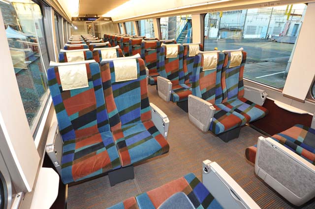クハ70351の一般客室.デハ70301と似ているが,頭上の荷物棚がない.両先頭車はすべて展望室,という考え方のもと,ダイナミックな眺望を確保している.