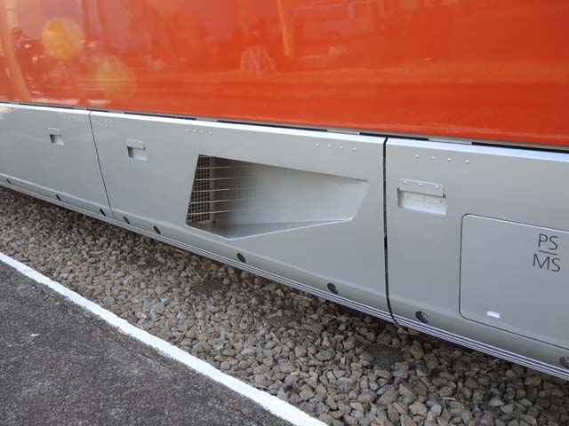 注目したいところは限りなく存在したが,もっとも目を惹いたのが,デハ70301の海側スカートに開けられた,インバータ素子冷却用の空気取り入れ口.まるでレーシングカーやスポーツカーのエアインレットのようだ.