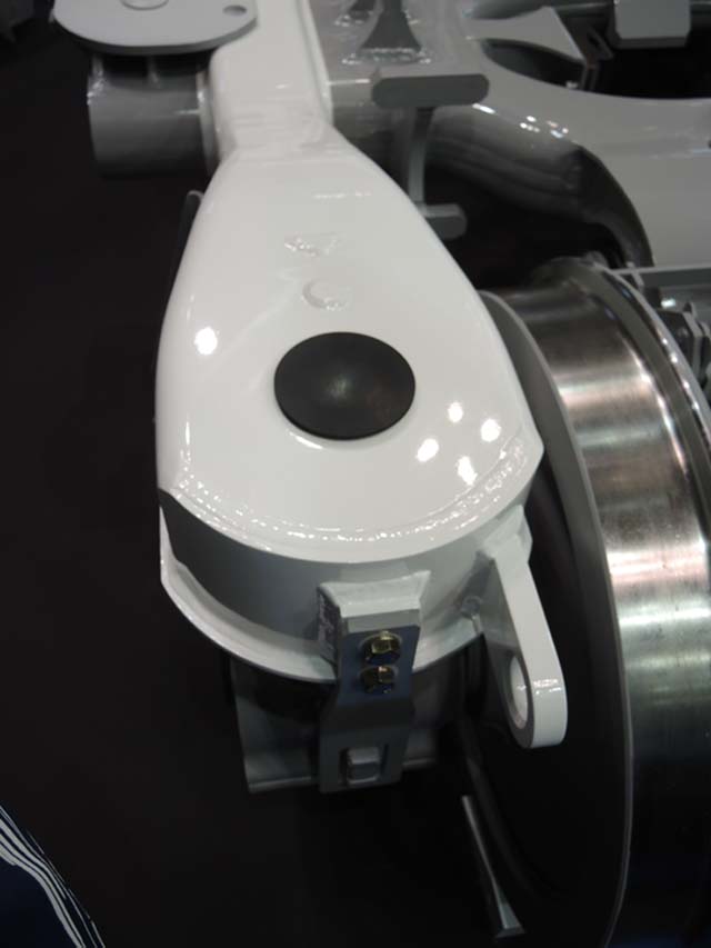 さらにさらに,ブレーキ装置のユニットを車輪と横梁の間に置くことができるから,必要に応じて軸距を短くすることができる.それによって床下機器の艤装スペースを拡張できる…軸距が短くなることで失われるかもしれない“ふんばり”は,剛性向上と差し引きできるのだという.