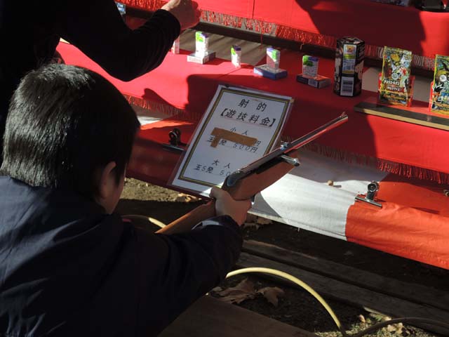 せめてもということで出掛けた元旦の初詣,今年は目黒不動へと向かった.山手線の目黒から目蒲線…じゃなくって目黒線,というのは頭では解っていても,つい口をついて出てしまうのは,僕の親が長い間“省線が…”と言っていたと同じことだろう…その目黒線に乗り換えて歩くことしばし.思っていたよりこじんまりしたお不動さんの参道には,昔ながらの屋台が並び,商店街の各お店も机を出して甘酒を振る舞ったりと賑やか.その一角には,射的や輪投げの屋台も,まったくごく自然に立ち並んでいた.