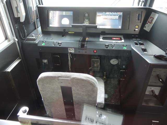 昨日は運転室の公開はなかったが,仕切窓から垣間見た機器配置をお目にかけよう.マスコン・ブレーキはT字の両手操作式.