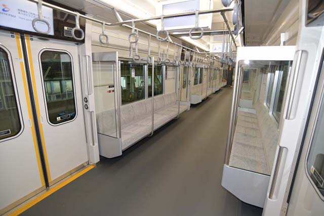 客室デザインは,そもそも色遣いをグレー系に統一したのが大胆だし,照明は時間帯によって昼光色や電球色に変化させつつ運転する.各部にガラスや金属を採用しているのも特徴.車体幅が相模鉄道標準タイプより狭いのをフォローするように務められている.