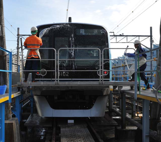 最初は車体洗浄風景の観察.洗車線にやってきたのは,15000系第2編成.この日は10輛全部の内装と,西船橋方5輛の外装の洗浄が行なわれた.