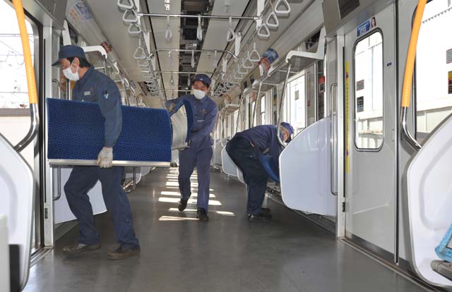午後一番の見学は,腰掛座面と背摺りの取り外し作業.車外へ運び出されたシートは別の場所で丁寧に洗浄される.