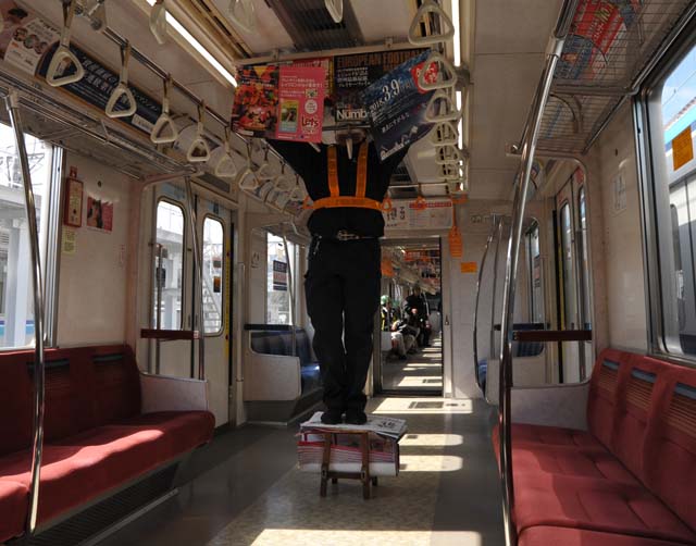 時には折り返し待ちの電車車内で見かける光景ではあるが,両手にポスターをもって,一気に両面2枚ずつ取り替えてしまう技には,常に感心されられてしまう.
