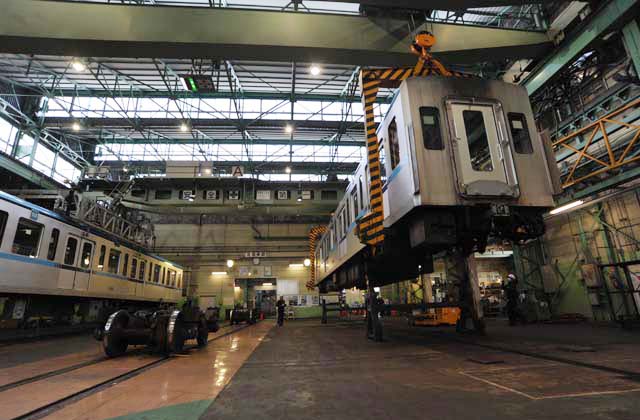 定位置についた15000系第6編成の1号車.2基の15t天井走行クレーンで吊り上げ,隣りの作業スペースへ移動する.