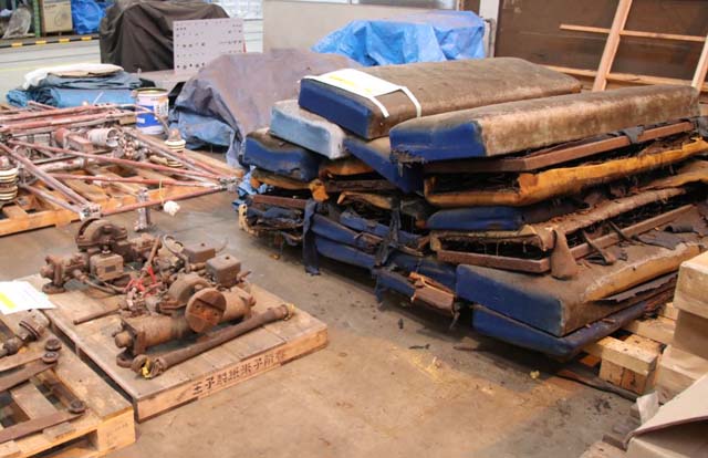 1月下旬.取り外され,京急ファインテック久里浜事業所への移送のため集積されたインテリア部品.左端のパンタグラフやその手前の戸閉機械(ドアエンジン)などはオリジナルだろうか.銘板が気になる…….写真:京浜急行電鉄