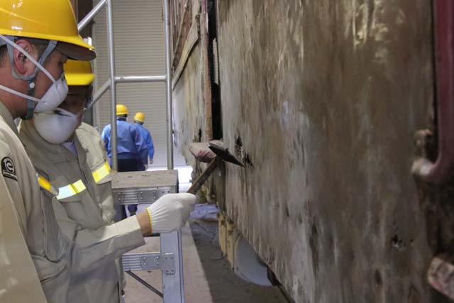 最初は,車体の状況調査.ハンマーで外板を叩くなどして腐蝕具合を探る.写真:京浜急行電鉄