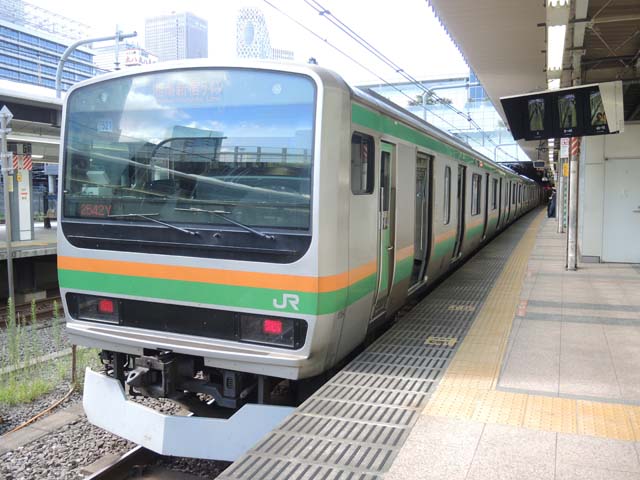 さてこの日,中央快速線に出向く前の湘南新宿ラインホームに到着したE231系を見て驚いた.前照燈がLED化されていたのである.