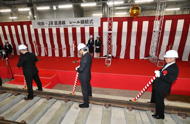 相模鉄道の滝澤秀之社長とJR東日本横浜支社の廣川 隆支社長,そしれそれぞれのマスコットによって,11月30日に開業と発表された.
