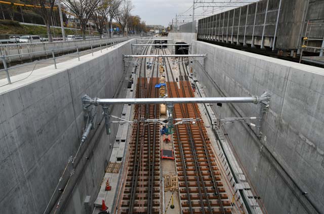 架線も張られ,いつでも電車が走ることができるようになった新線.両側が横浜貨物線への接続線路.真ん中の2本は新横浜経由で日吉へ向かう.架線は,吊架線が饋電線を兼ねるハイパーインテグレート架線を採用している.吊架線も銅色に光り輝いているのは,そのためである.