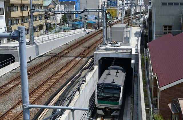 新線は羽沢横浜国大駅からずっと地下線というかトンネルを走り,地上へ顔を出すのは,ほんとうに西谷駅の直前.既に構内という地点である.どう撮ろうか,悩むまでもなく,トンネル出口のすぐそばにある歩道橋から見下ろすしかない.