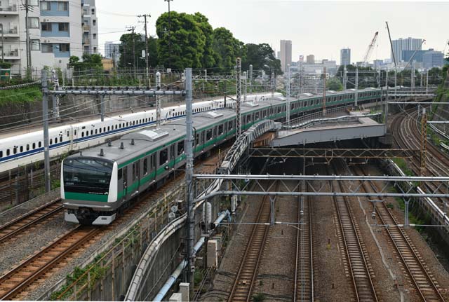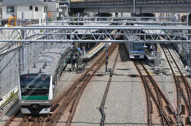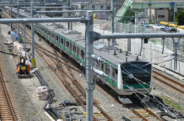 幸いにして今日もE233系は元気よく試運転にいそしんでいた.そればかりか,相鉄12000系も併せて記録することができたのだった.今日はホームではなく大井町…というか川崎というか西大井というか五反田というか新横浜というか!…方の跨線橋に出向いた.その跨線橋から品川へ到着のE233系を捉えたのが,この写真である.