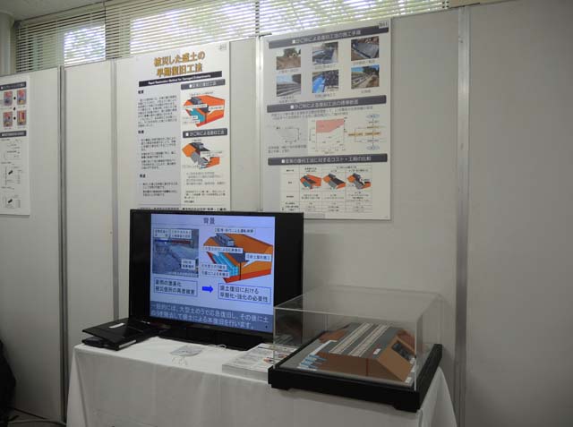 軌道といえば,災害により被害を受けた盛土や擁壁を,いかに効率よく復旧するか,という研究も進められている.大きな土嚢を積んで刈り復旧して,それから土嚢を撤去しながら本復旧というのは二度手間である,だから,かご枠を積んで仮復旧し,本復旧に際しては,かご枠を埋めこんでしまうことで復旧完了までの時間と費用を大幅に減らすことができるとのこと.