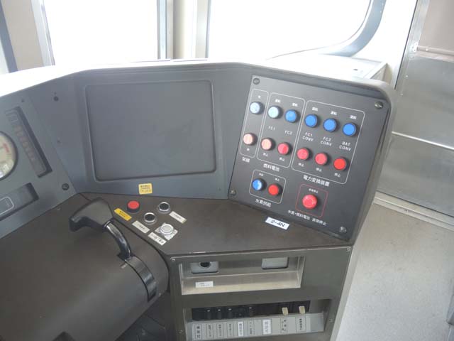 運転台で新しいのは右手に設けられた燃料電池や電力変換装置のための操作パネル.