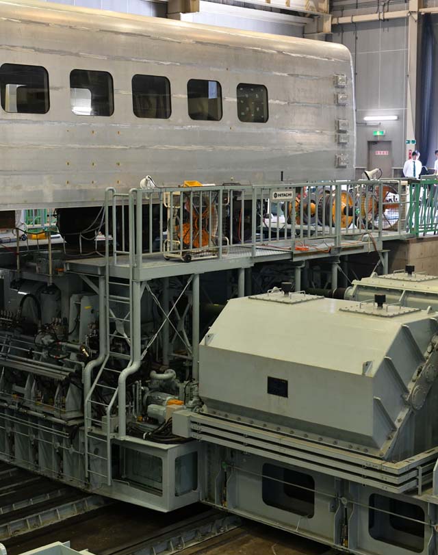 二番目に興味津々だった高速車両試験台.はるか昔には大井の石炭試験所にあった…などというのは,もちろん文献と写真でしか知らない.国立へ移転してからの初代も,1990年に完成した,最高時速500kmまでの試験を実施することが可能だという新しい試験台も,そのつもりでじっくりと観察するチャンスは,これまで残念ながら得られていなかったのだ.