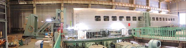 試験台の全景と,載せられた新幹線サイズの車輛.コンパクトデジカメのパノラマ機能を使って撮影したものである.