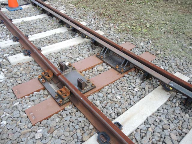 地域鉄道に適したロングレール軌道構造…なのだそうだ.列車に乗っていて聞こえてくるレールの継目を通過する音は,旅情を掻き立てるものだけれど,保線の人々には苦労の種である.それを解消するためにはロングレール化がもっとも効果的な手段である.けれど非常なコストがかかる.それを解決するために考案されたシステムの一部が,これ.最大13cmの遊間を持つ継目を,これまでの伸縮継目の替わりとすることが可能なのだそうだ.四角い大きな板でレールの左右動を抑え込むことで乗り心地を確保し,騒音も低減できるとのこと.模型のレイアウトでギャップを切った部分のレールがリアリティに欠けるという指摘は,過去のものになるかもしれない.