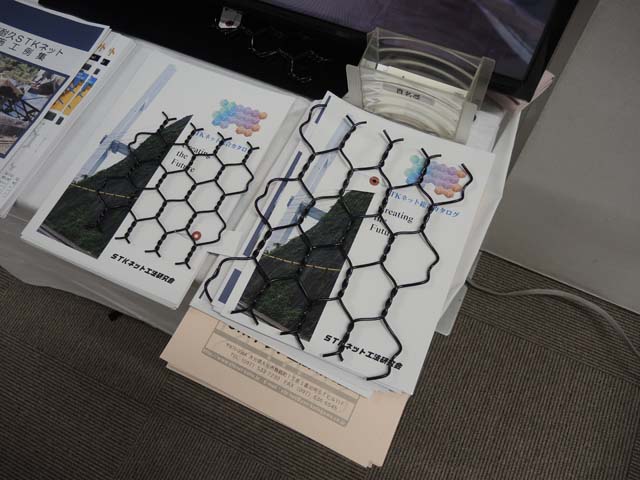 最近の盛土や擁壁の復旧というか補強工事では,コンクリートの型枠による補強やモルタルの吹きつけが多いように思う.確かに工期の面でも費用の点からも,それらが一番なのかもしれないが,どうも趣味的には美しくない.ということで石積み壁の補強用として開発されたというネットも展示されていた.