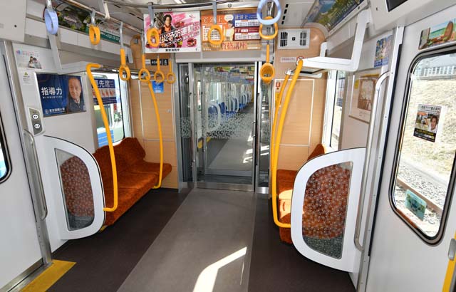 池袋・本川越方先頭車の“パートナーゾーン”.手前の腰掛がロングシートであることを除けば,色遣いをはじめとしてデュアルシート仕様編成と変わるところはない.