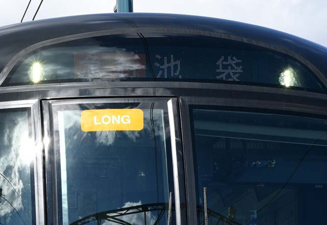 この写真の角度から判る,デュアルシート仕様との違いは車号のほか正面貫通扉上部に貼られたオレンジ地白文字の“LONG”表示.この表示は側面行先表示装置横にも貼られている.