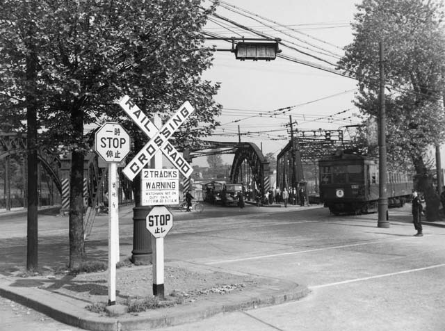 品川と北品川の間.八ツ山橋を行くデハ230形.既にツートンカラーになっている.高田さんは電車もさる事ながら,踏切標識に強い関心をお持ちだったようで,ピントはこちらに合わされている.昭和24/1949年 写真:高田隆雄
