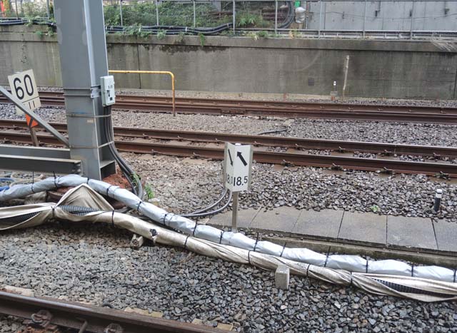 18.5‰の勾配標.先日までの仮跨線橋の真下あたりに植えられている.裏は18.0%.レベルから10‰,18.0‰と,目まぐるしく変化する.