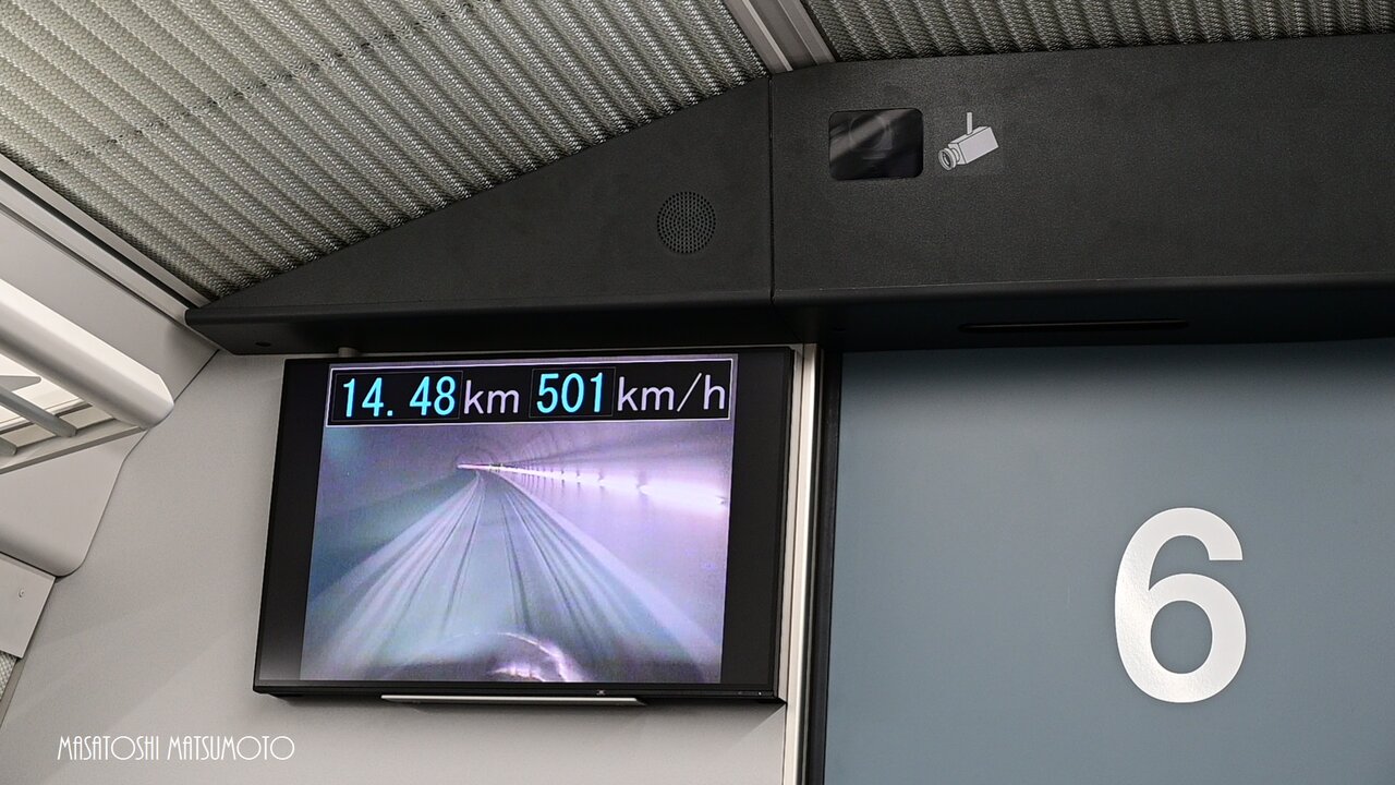 今回42.8kmの実験線で、500km/hの試乗を2往復体験。ほぼトンネルなので車窓はあまり見えないが、前方確認カメラからの映像と速度表示で実感は可能でした。