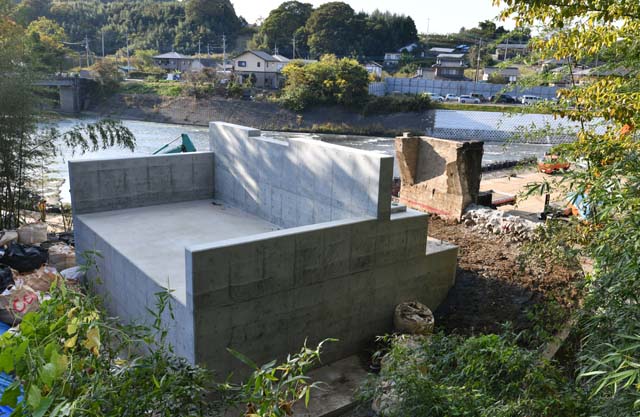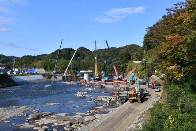 同じ左岸の下流側に架か道路橋から見た工事現場全景.JR東日本水戸支社が発表している完成予想図ではトラス桁は緑色に塗られることになっている.