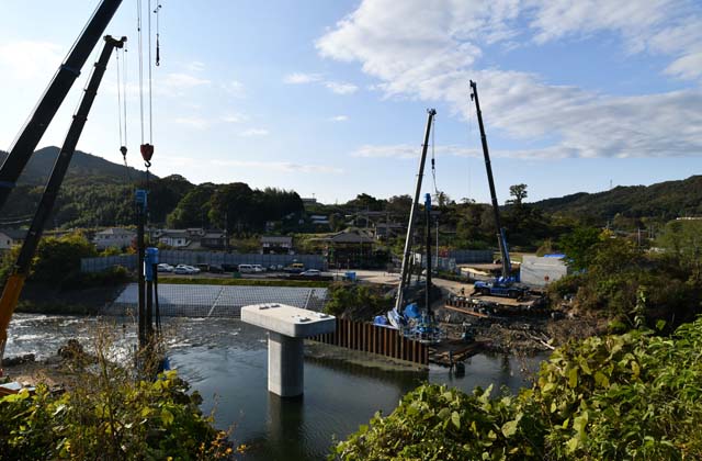 左岸の上流から見た工事現場.これまでは6基の橋脚が立っていたのが,1基になる.桁は,下路トラスとなるようである.