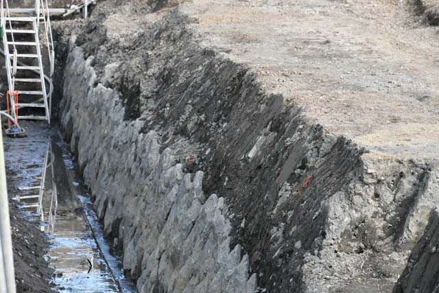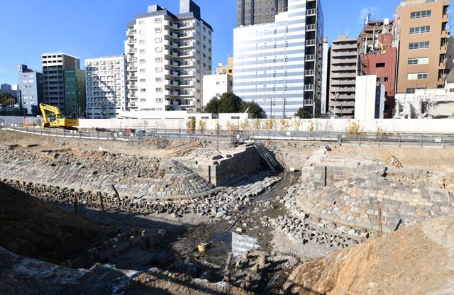 右手に見える高架橋は東海道新幹線.石垣は海側よりも切り立っている.随所に手作業で進められた発掘作業の跡が見える.