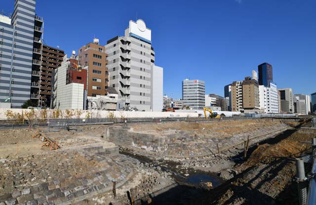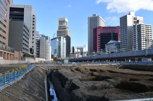 品川方から田町方を望む.先ほどのポイントから南へ下がったポイントである.大木戸跡付近も写りこんでいる.かつての山手線や京浜東北線の線路跡にパワーショベルが留置されている.発掘された築堤からこちら側は田町電車区の敷地になるのだろうか.