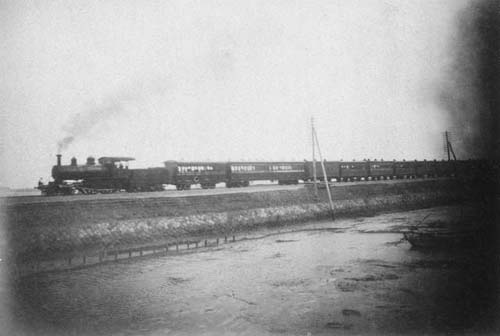 品川から新橋目指して快走する6150形牽引の旅客列車.レイルの写真説明ではバラストの新しさを撮影年代推定の根拠としたが,現地を観察して,石垣の積み方からほぼ確証となった.写真所蔵:前里 孝