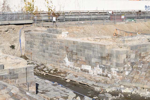 続いて案内されたのが,もっとも品川駅に近い,ポイントA.7号橋梁の橋台が露出した部分で,今回公開された遺跡の中で,ハイライトともいうべき部分である.