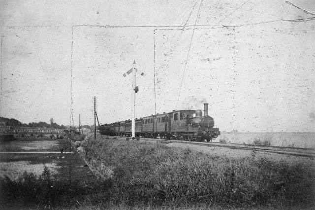 高輪海中(海上)築堤を行くA8牽引の旅客列車.印画紙(鶏卵紙)の汚れや劣化は惜しいが,実にあの築堤の実際を表現した名作だと思う.A8にしても,これほど生き生きと誇らしく活躍している姿は,それほど多く残されているわけではない.写真:松鷹文庫