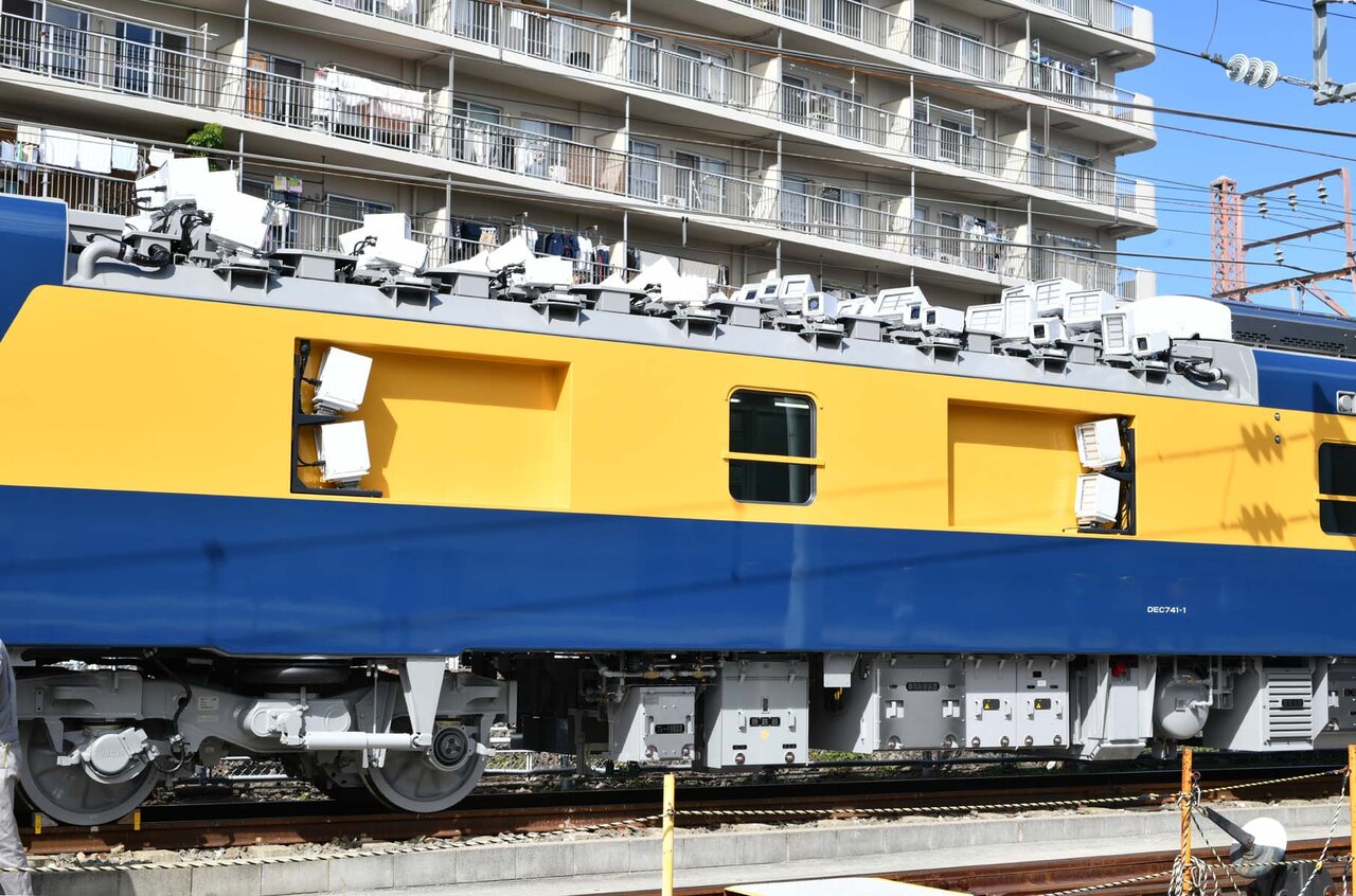 車体側面と屋根には無数のカメラや測定装置,照明器具などが設置されている.とりわけDEC741-1では車体を窪ませての取り付けなど,苦労の跡をうかがい知ることができる.
