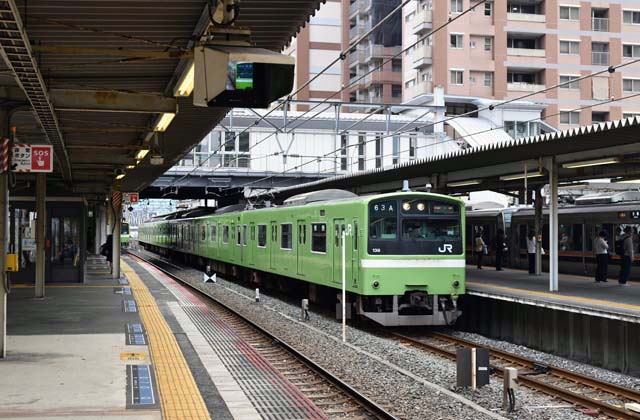 ということで8時半過ぎに新大阪駅1番線に到着した僕を待っていたのは,うぐいす色の201系だった.関東地方では姿を見なくなって久しい201系も,大阪ではまだまだ現役.先頭はクハ200-77.1983年の川崎重工製である.