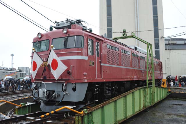 転車台上のEF81 81.日章旗の交点には菊のご紋章ならぬJRマークが.これはこれで,サマになっていた.