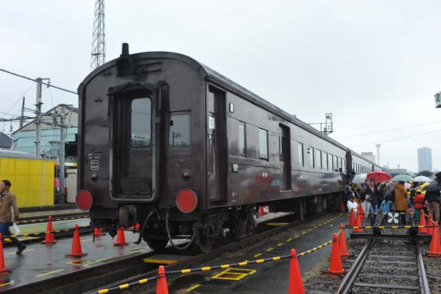 実は,この客車をじっくり眺めるのは初めてのこと.改造落成時の報道公開では,なぜだか都合がつかなくて,その後もこの車輛が充当されている姿にも遭遇することがなかったから.妻板の銘板の数が,この客車の来歴の複雑さを物語っている.