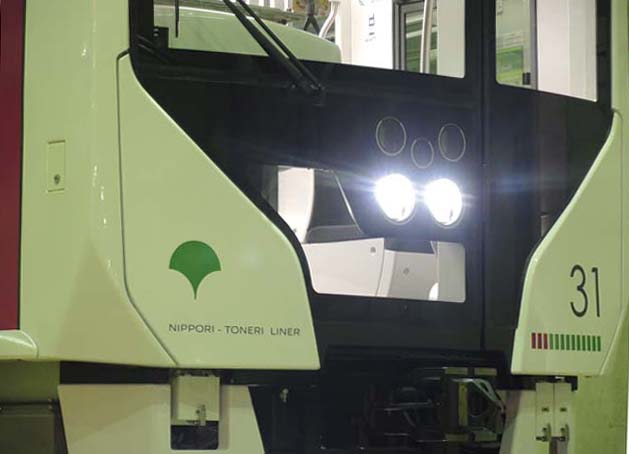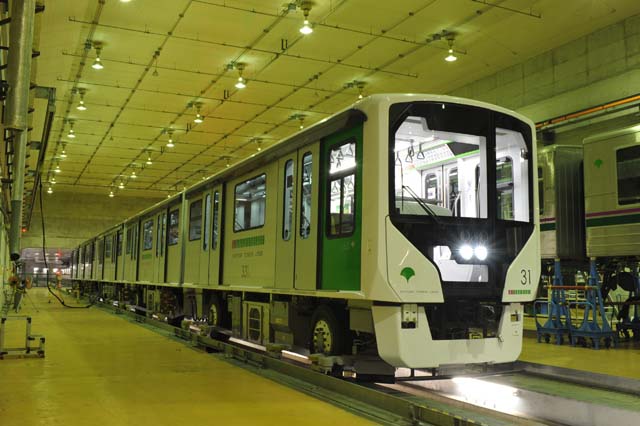 報道公開は舎人公園駅の近くにある車庫で催された.留置線でポーズをとる新型車は,製造担当が新潟トランシスから三菱重工に移り,車体の素材もステンレス鋼からアルミ合金製に変更となっている.全体のデザインもほぼ一新.側扉も片開きから両開きに変更されている.