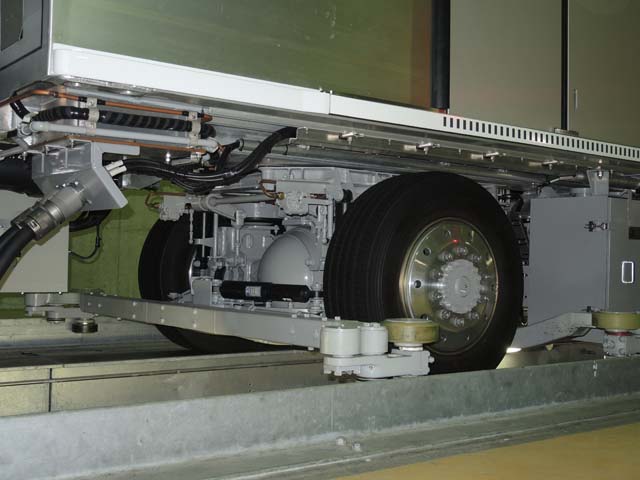 MTR303形台車.4案内輪車軸ボギー式という.タイヤ間にちらりと見える通り,デファンレンシャルギヤー(差動装置)を介した直角駆動式.タイヤには普通の空気ではなく窒素ガスが充填されている.