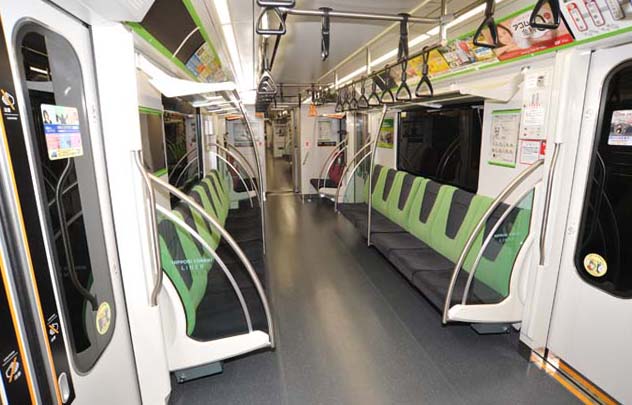 一歩客室に足を踏み入れると,腰掛けがオールロングシートであることに気づかされる.最初に記した通り,この路線の乗客数は増える一方であり,混雑緩和のための措置だという.照明はカバー付きタイプのLED.ちなみに前照燈も尾燈もLEDである.